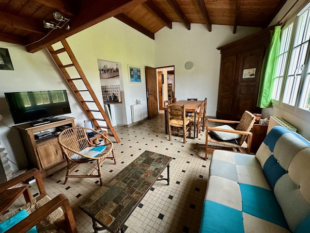 ENTRE KER BOSSY ET KER CHALON - MAISON AVEC STUDIO ATTENANT Maison d'habitation comprenant : un salon/salle à manger avec mezzanine, une cuisine, 2 chambres dont une avec mezzanine, une salle de douche et un WC. Studio attenant comprenant : un salon ou 3ème chambre avec cuisine, une salle de douche, un WC et une mezzanine. Un garage à vélo indépendant. Sur une parcelle d'environ 1470m², en zone UB constructible à 70%. Les + : Isolation par l'extérieur, électricité rénovée, double vitrage récent, assainissement conforme. Possibilité d'acquérir en plus une parcelle de 480m². Pour plus d'information contactez l'agence SAINT SAUVEUR IMMOBILIER YEU Les informations sur les risques auxquels ce bien est exposé sont disponibles sur le site Géorisques : www.georisques.gouv.fr
